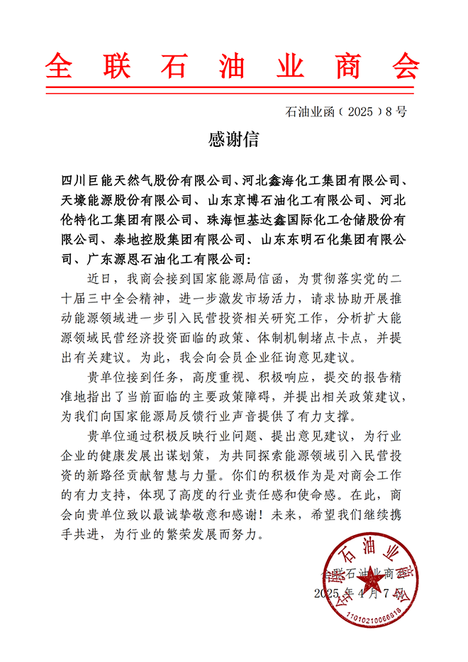 恒基達(dá)鑫作為全聯(lián)石油業(yè)商會副會長單位,始終以行業(yè)發(fā)展為引領(lǐng),踐行責(zé)任擔(dān)當(dāng)。近日,公司收到全聯(lián)石油業(yè)商會發(fā)來的感謝信,這份榮譽(yù),正是恒基達(dá)鑫對行業(yè)擔(dān)當(dāng)?shù)挠辛σ娮C。