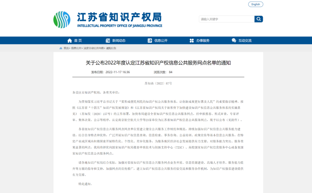 日前, 江蘇省知識(shí)產(chǎn)權(quán)局下發(fā)通知,公布了2022年度認(rèn)定江蘇省知識(shí)產(chǎn)權(quán)信息公共服務(wù)網(wǎng)點(diǎn)的名單,無錫三聚陽光知識(shí)產(chǎn)權(quán)服務(wù)有限公司、南京航空航天大學(xué)、南京郵電大學(xué)等23家單位獲認(rèn)定江蘇省知識(shí)產(chǎn)權(quán)信息公共服務(wù)網(wǎng)點(diǎn)。