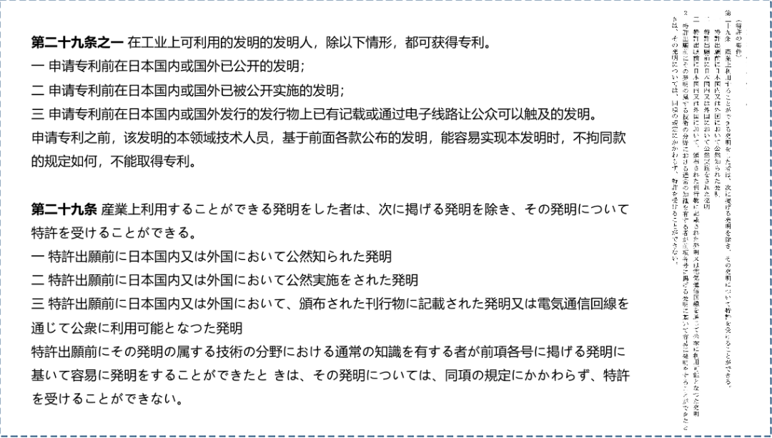 日本對新穎性的定義主要基于第二十九條,原文如下圖。該條法案被認(rèn)為提出了授予專利的條件,包括實(shí)用性(“工業(yè)上可利用”)、新穎性(列舉現(xiàn)有技術(shù)情形)、創(chuàng)造性(基于現(xiàn)有技術(shù)容易實(shí)現(xiàn)的不可專利)。