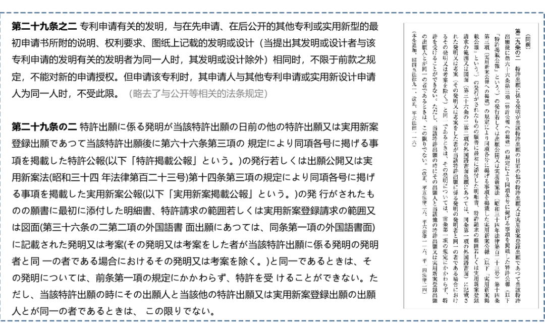 日本“抵觸申請”叫「拡大先願(yuàn)」(所謂“先愿”即“申請”),也被稱為「準(zhǔn)公知」,或「公知の擬制」,主要由《專利法》第二十九條第二款描述。