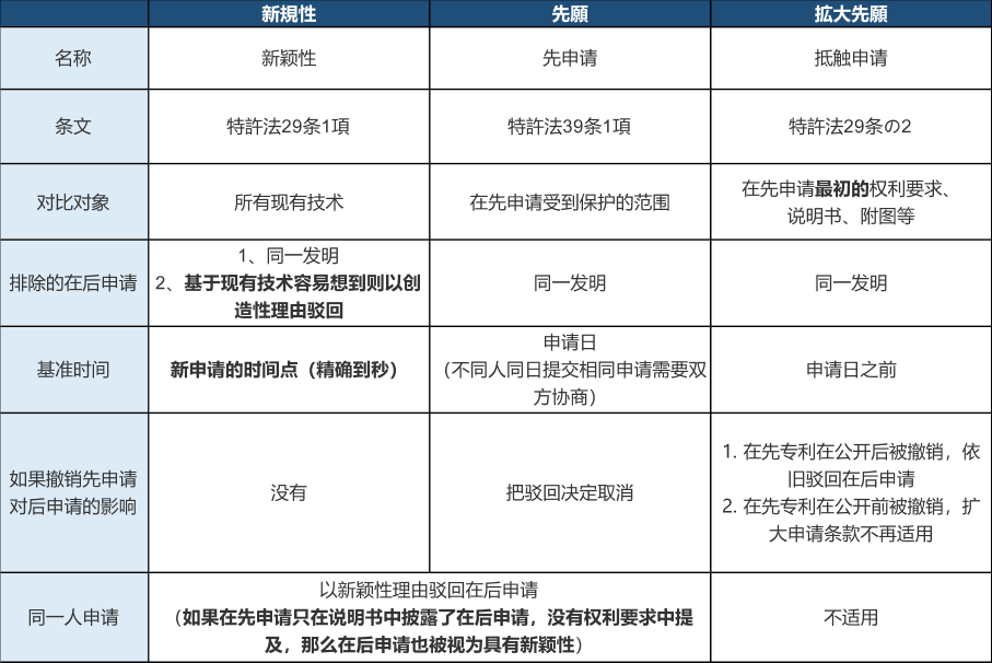 特別要注意,由于以上歷史原因,日本的“抵觸申請”條款不包含同一申請人或同一發(fā)明人的情形,所謂“相同”指代發(fā)明人完全相同或申請人完全相同。如果在先在后提交的兩份相同的申請的發(fā)明人全部相同或申請人全部相同,日本專利局不依據(jù)“擴(kuò)大先愿”駁回,轉(zhuǎn)而依據(jù)第三十九條「先願(yuàn)」的先申請制度,基于在后申請沒有「新規(guī)性」駁回。駁回的結(jié)果一樣,只是依據(jù)不同。中國則沒有這一例外。
