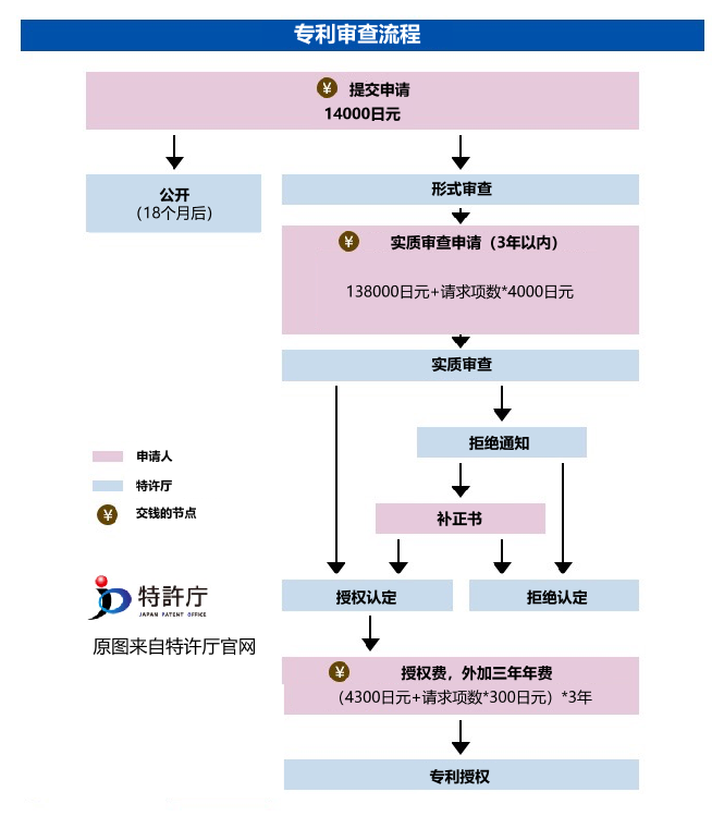 官費(fèi)總計(jì):發(fā)明專利,(授權(quán)+3年年費(fèi))約18萬日元,相當(dāng)于9000人民幣;實(shí)用新型,(授權(quán)+3年年費(fèi))約2萬日元,相當(dāng)于1000人民幣;外觀設(shè)計(jì),41500萬日元起,與是否有秘密設(shè)計(jì)、年份等均有關(guān)。