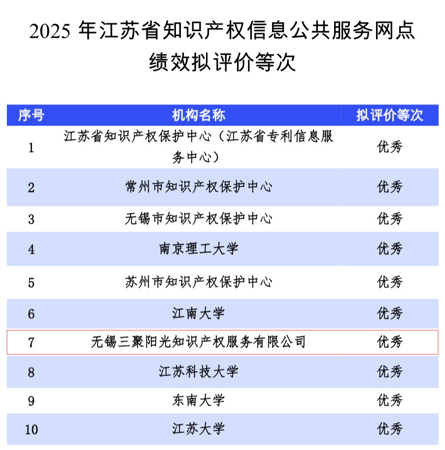 近日,江蘇省知識(shí)產(chǎn)權(quán)局發(fā)布《2025年江蘇省知識(shí)產(chǎn)權(quán)信息公共服務(wù)網(wǎng)點(diǎn)績(jī)效評(píng)價(jià)結(jié)果公示》,無錫三聚陽(yáng)光知識(shí)產(chǎn)權(quán)服務(wù)有限公司在本年度績(jī)效評(píng)價(jià)中獲評(píng)為“優(yōu)秀”等次。這是繼2024年度獲評(píng)“優(yōu)秀”等次之后,無錫三聚陽(yáng)光再次在江蘇全省績(jī)效評(píng)價(jià)中名列優(yōu)秀行列,顯示出公司在知識(shí)產(chǎn)權(quán)信息公共服務(wù)領(lǐng)域持續(xù)穩(wěn)定的服務(wù)能力與專業(yè)水準(zhǔn)。