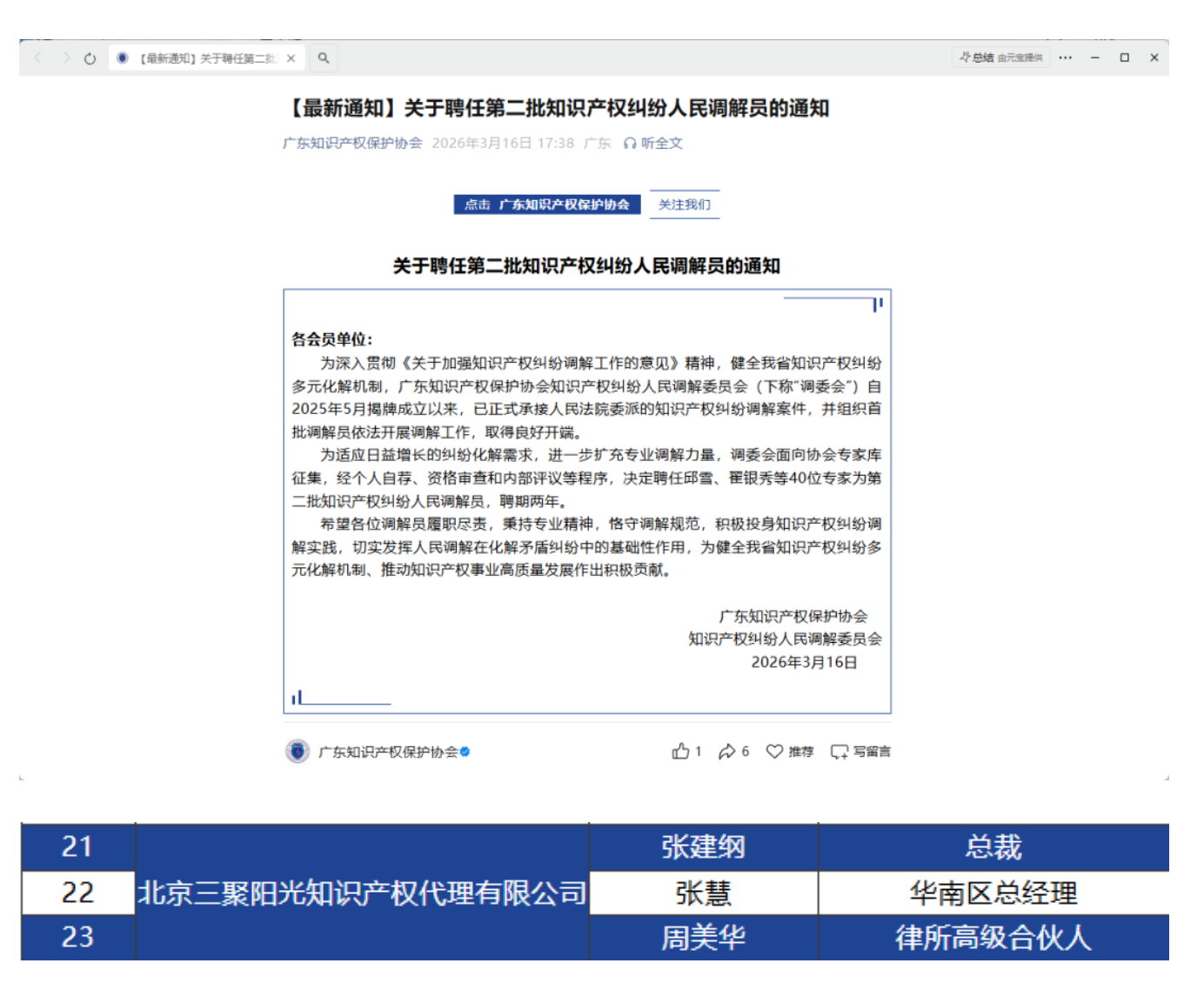 三聚陽光長期關(guān)注知識產(chǎn)權(quán)保護鏈條中的爭議預防、糾紛處置與協(xié)同保護。此前,三聚陽光曾赴中國(廣州)知識產(chǎn)權(quán)保護中心開展交流,就快速協(xié)同保護、維權(quán)援助、知識產(chǎn)權(quán)分析咨詢等議題進行溝通;深圳地區(qū)主管單位也曾到訪三聚陽光北京總部調(diào)研。此次三位專業(yè)人士獲聘廣東省知識產(chǎn)權(quán)糾紛人民調(diào)解員,有望進一步推動公司在華南地區(qū)更好參與知識產(chǎn)權(quán)糾紛多元化解實踐,為創(chuàng)新主體提供更專業(yè)、更高效、更具前瞻性的服務支持。