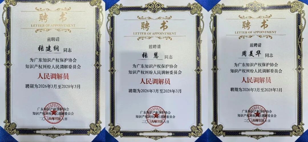 近日,三聚陽光總裁張建綱、華南區(qū)總經(jīng)理張慧、法律業(yè)務負責人周美華獲聘廣東省知識產(chǎn)權(quán)糾紛人民調(diào)解員。這一殊榮不僅是對三聚陽光專家團隊個人專業(yè)素養(yǎng)的行業(yè)認可,更是對三聚陽光長期致力于知識產(chǎn)權(quán)糾紛預防與化解、構(gòu)建和諧創(chuàng)新生態(tài)的高度肯定。