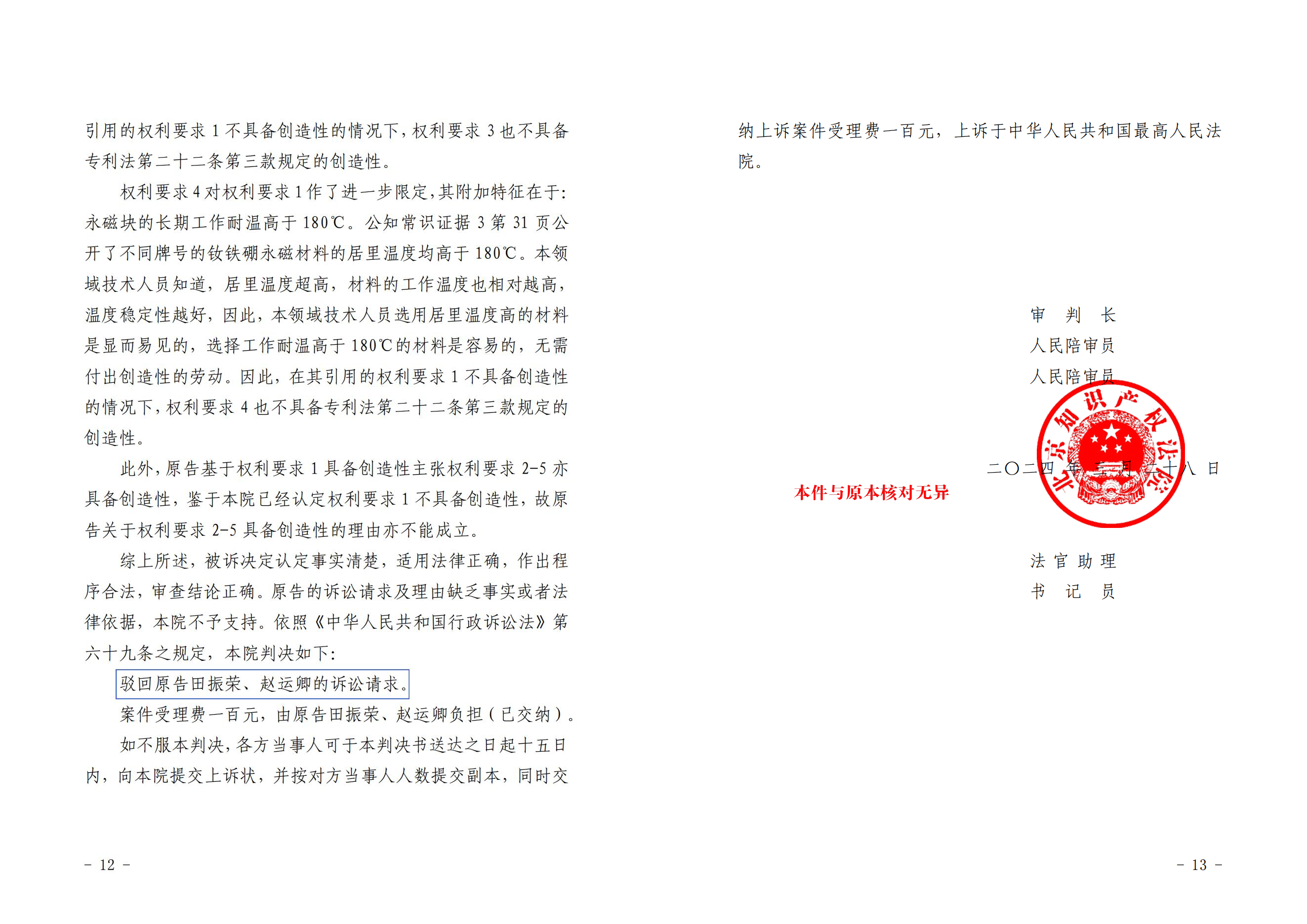 北京知識(shí)產(chǎn)權(quán)法院駁回對(duì)“汽車發(fā)電機(jī)的永磁塊轉(zhuǎn)子”專利無效決定的訴訟請(qǐng)求