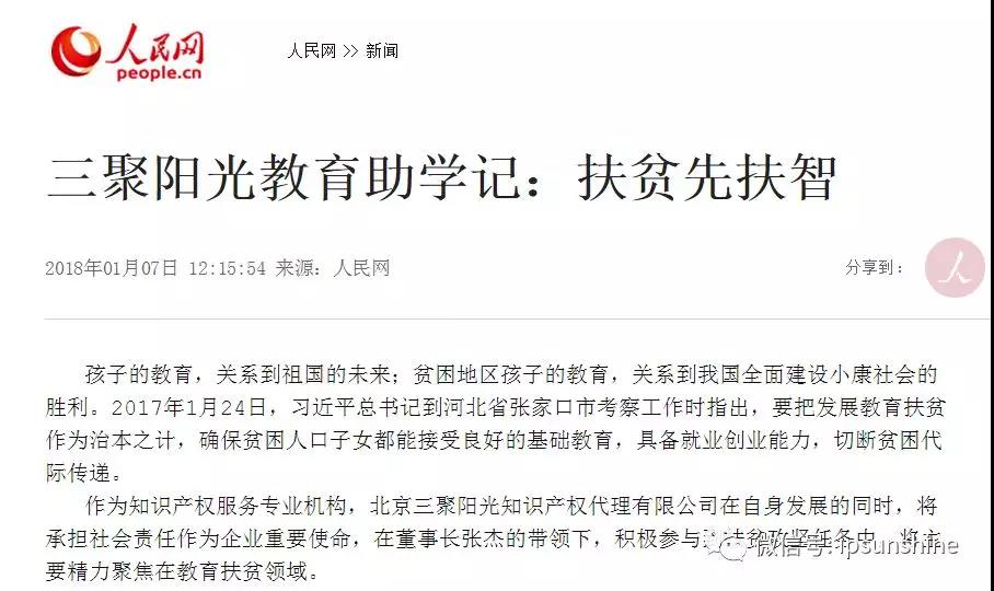 ?  扶貧濟(jì)困是中華民族的傳統(tǒng)美德,也是我國(guó)社會(huì)主義精神文明建設(shè)的重要組成部分。三聚陽(yáng)光擁有17年發(fā)展歷史,通過(guò)誠(chéng)信經(jīng)營(yíng),在知識(shí)產(chǎn)權(quán)服務(wù)工作中不斷取得新進(jìn)展。在取得可喜成績(jī)的同時(shí),公司各級(jí)領(lǐng)導(dǎo)及員工一貫高度關(guān)注社會(huì)公益事業(yè),時(shí)刻銘記公司“敬天愛人”的核心價(jià)值觀,懷揣著一份回饋社會(huì)的情懷,積極履行社會(huì)責(zé)任。1月7日,人民網(wǎng)刊發(fā)文章《三聚陽(yáng)光教育助學(xué)記:扶貧先扶智》,現(xiàn)予全文轉(zhuǎn)載,以饗讀者。