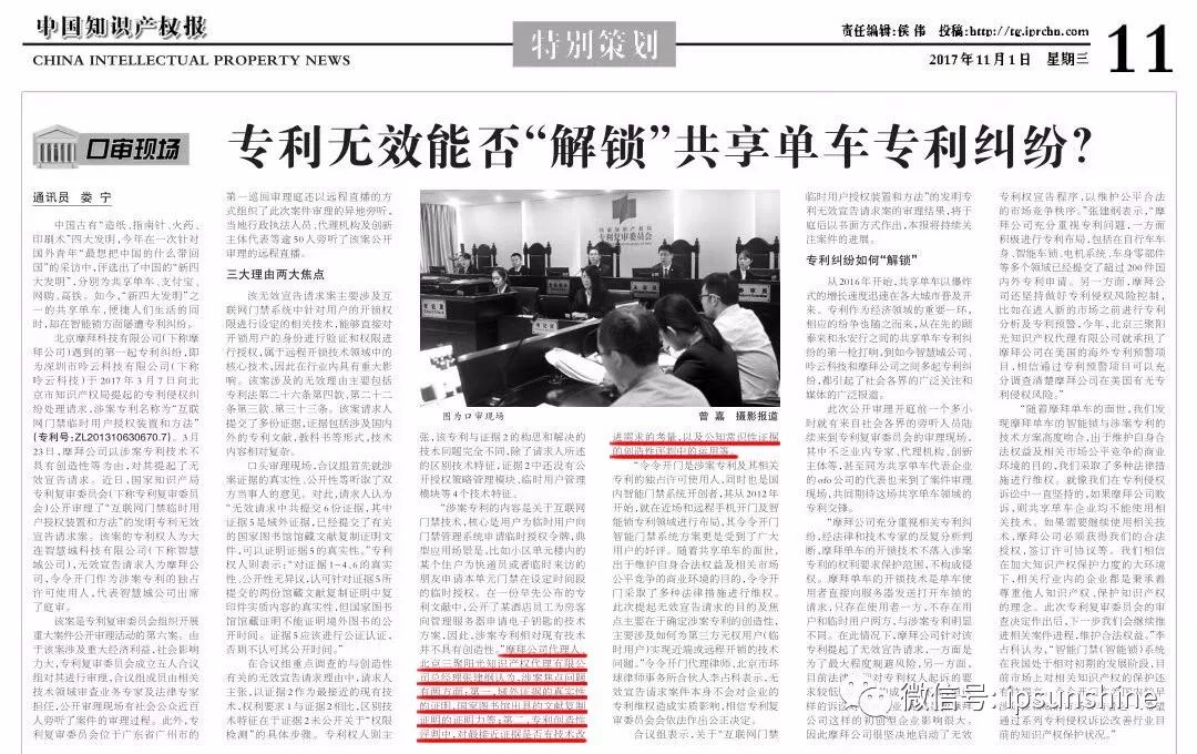 《中國(guó)知識(shí)產(chǎn)權(quán)報(bào)》專題報(bào)道我司代理的摩拜單車專利權(quán)無(wú)效宣告案