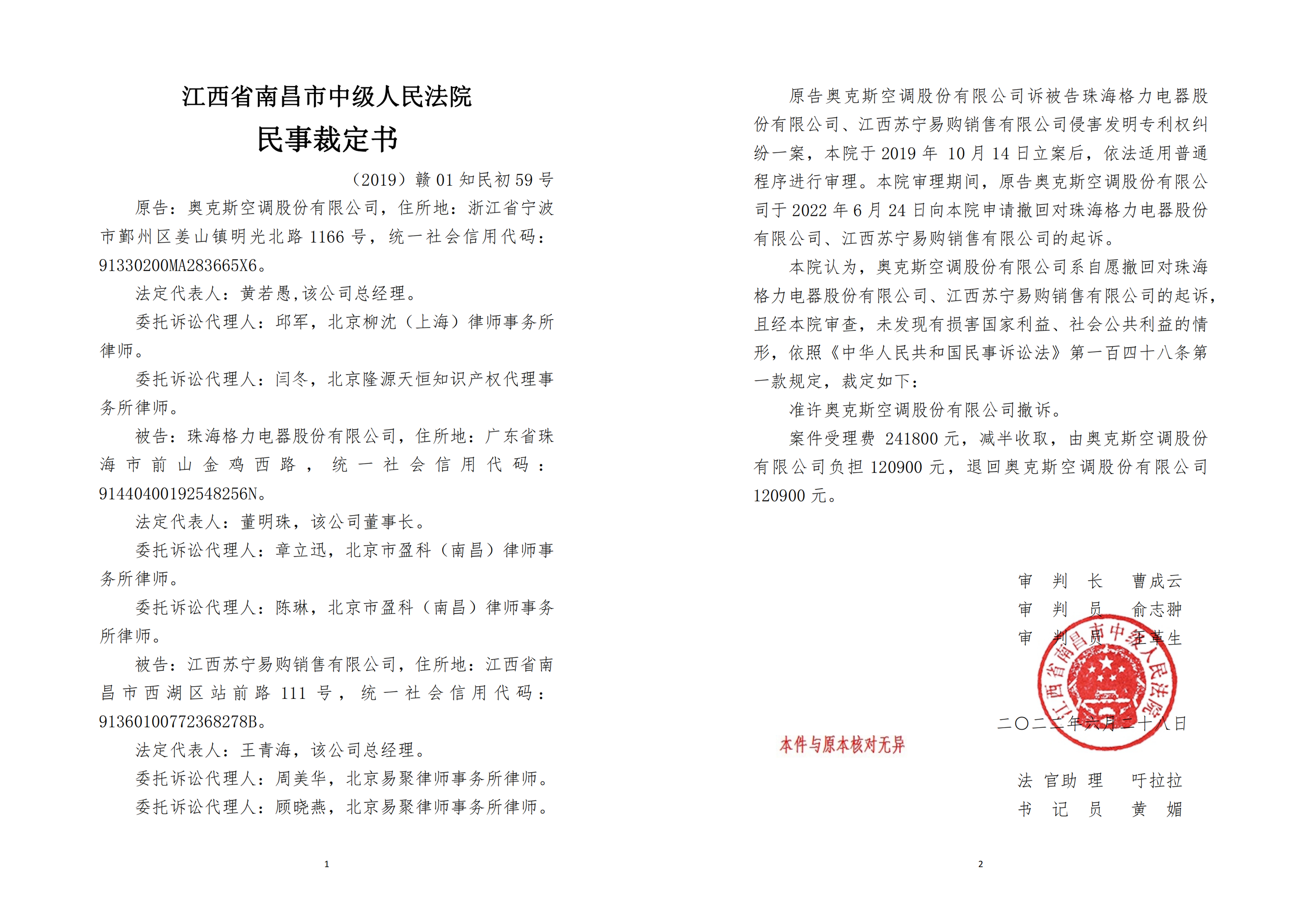 近日,江西省南昌市中級(jí)人民法院下發(fā)(2019)贛 01 知民初 59 號(hào)、(2019)贛 01 知民初 60 號(hào)兩份民事裁定書(shū),準(zhǔn)許奧克斯空調(diào)股份有限公司撤銷對(duì)珠海格力電器股份有限公司、江西蘇寧易購(gòu)銷售有限公司的侵權(quán)訴訟。此次兩件侵權(quán)訴訟標(biāo)的額達(dá)8000萬(wàn)元,北京三聚陽(yáng)光知識(shí)產(chǎn)權(quán)代理有限公司和北京易聚律師事務(wù)所是格力電器和蘇寧易購(gòu)的聯(lián)合代理機(jī)構(gòu)。