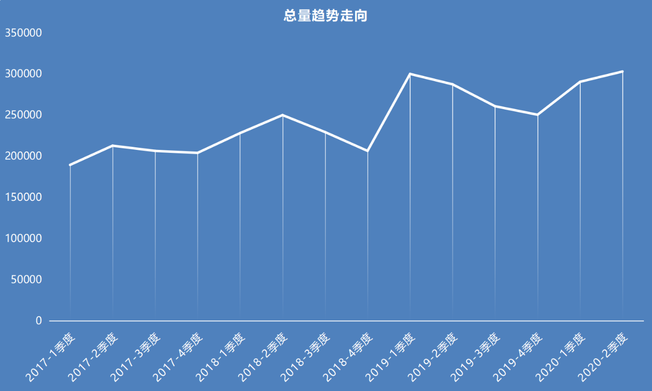 總體來(lái)看,結(jié)案量總量在2017年一季度到2018年四季度期間略有波動(dòng),但沒(méi)有明顯的增加趨勢(shì)。不過(guò)從2019年一季度起,結(jié)案總量提升明顯,每季度平均結(jié)案量從約20萬(wàn)件提升到了30萬(wàn)件左右。