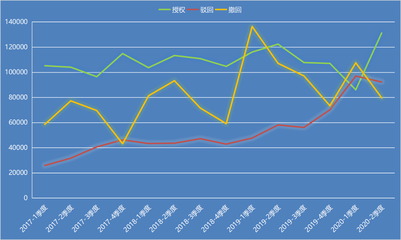 另外,國(guó)家近年來(lái)一直重視提升專(zhuān)利質(zhì)量,所以駁回率出現(xiàn)較大幅度的提升,而授權(quán)率有明顯的下降趨勢(shì),但從2020年第二季度數(shù)據(jù)來(lái)看,盡管駁回率變化不大,但駁回量已經(jīng)出現(xiàn)下降趨勢(shì),授權(quán)量和授權(quán)率也都有明顯上升趨勢(shì),有可能專(zhuān)利審查尺度在逐漸回歸本質(zhì),國(guó)家也在一直積極倡導(dǎo)提升專(zhuān)利質(zhì)量、培育高價(jià)值專(zhuān)利,相信未來(lái)更多的高質(zhì)量專(zhuān)利和潛在高價(jià)值專(zhuān)利會(huì)得到授權(quán)。
