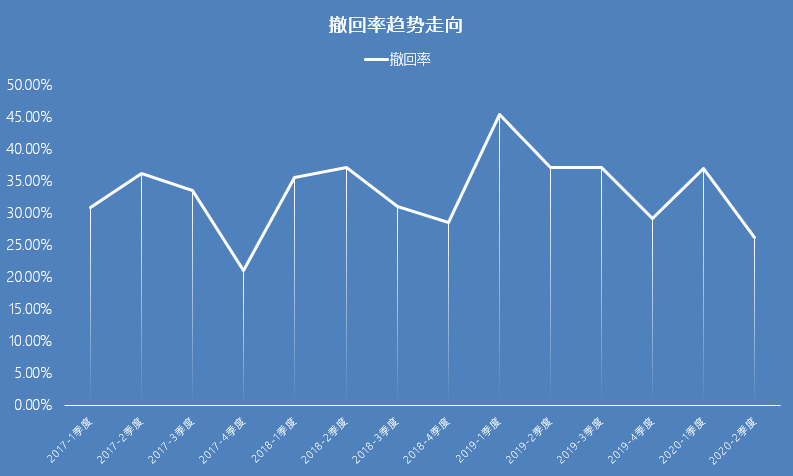 相較之下,撤回率近年來(lái)波動(dòng)明顯。如圖7、圖8所示,撤回率通常上半年高于下半年,2019年第一季度撤回率曾一度達(dá)到45.5%,而各年度第四季度撤回率則均出現(xiàn)較明顯下降,2020年第一季度撤回率與往年第一二三季度的均值差距不大,但第二季度撤回率下降明顯,僅為26.3%,略高于2017年第四季度視撤率谷值21.1%。