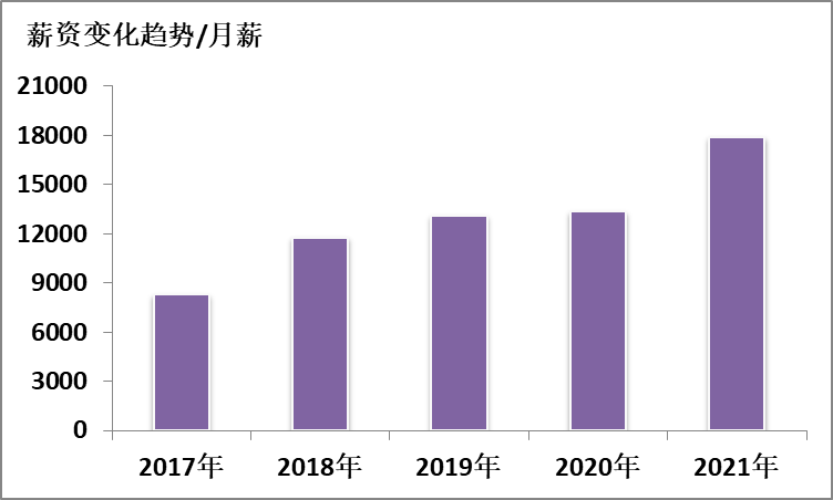 圖4展示出了小伙伴們比較關心的薪資統(tǒng)計數(shù)據(jù),不難看出,近年來專利分析師的薪資一路看漲,崗位平均月薪在2018年和2021年分別實現(xiàn)了較大幅度的增長,2021年平均月薪更是接近18k,或許有些人會說,和互聯(lián)網(wǎng)項目比這還算不上高薪,但我們關注的應該是趨勢,是詩和遠方。