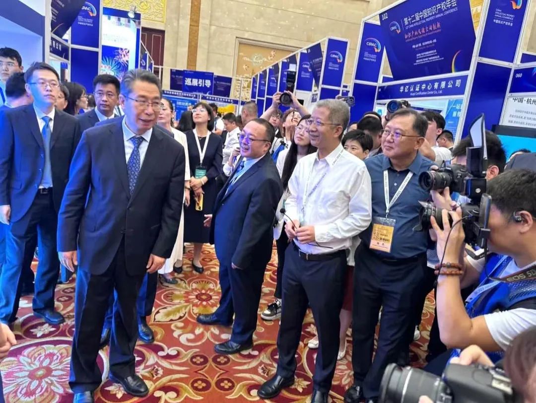 9月19日上午,國(guó)家知識(shí)產(chǎn)權(quán)局局長(zhǎng)申長(zhǎng)雨(左一)參觀了部分展區(qū),會(huì)見了嘉賓代表。右一為三聚陽(yáng)光知識(shí)產(chǎn)權(quán)集團(tuán)董事長(zhǎng)張杰
