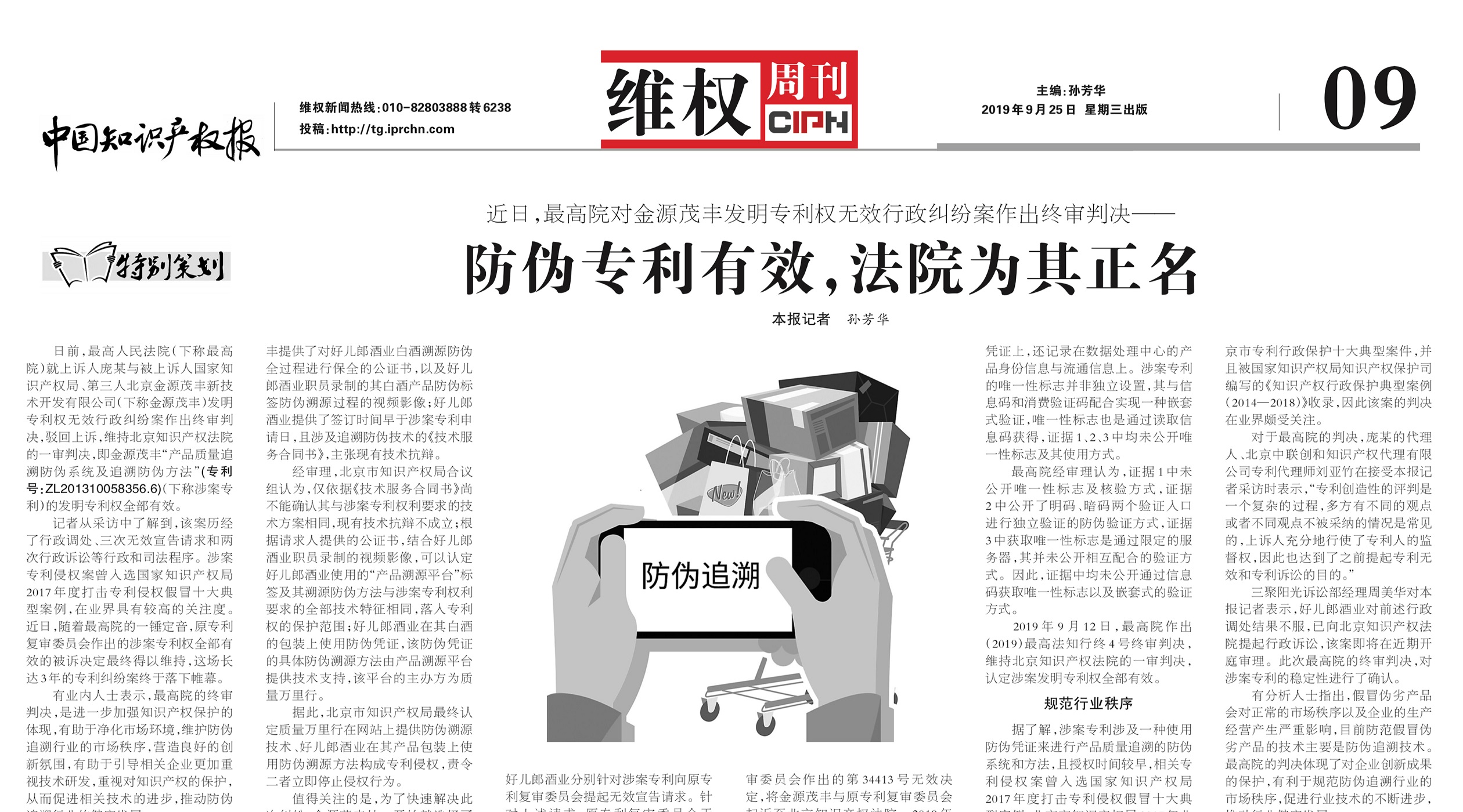 日前,最高人民法院(下稱最高法)就上訴人龐某與被上訴人國家知識產權局、第三人北京金源茂豐新技術開發(fā)有限公司(下稱金源茂豐)發(fā)明專利權無效行政糾紛案作出終審判決,駁回上訴,維持北京知識產權法院的一審判決,即金源茂豐“產品質量追溯防偽系統(tǒng)及追溯防偽方法”(專利號:ZL201310058356.6)(下稱涉案專利)的發(fā)明專利權全部有效。